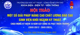 Ngày 14 tháng 10 năm 2022, Khoa Điện – Điện tử – Viễn thông phối hợp cùng Ban Tổ chức các Hội thi, Hội thảo Nhà trường tổ chức Hội thảo “Một số giải pháp nâng cao chất lượng đào tạo sinh viên khối ngành kỹ thuật”. Hội thảo nằm trong chuỗi hoạt động của nhà trường nhằm thiết thực chào mừng kỷ niệm 10 năm xây dựng và phát triển Trường Đại học Kỹ thuật – Công nghệ Cần Thơ (29/01/2013 – 29/01/2023).